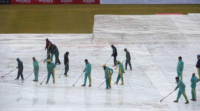 Ground staff remove rain water from the pitch during the fourth day of the first Test match between Pakistan and Sri Lanka at the Rawalpindi Cricket Stadium in Rawalpindi on December 14, 2019. Photo: AFPRAWALPINDI: Overnight rain and poor light continued to mar Pakistan's first home Test in a decade on Saturday, with officials calling the fourth day off before play had begun.Groundsmen wiped water from the pitch covers and rolled out a super sopper, but overcast conditions and poor light forced umpires Richard Kettleborough and Michael Gough to call off play at 12:00 local time.Both the Pakistan and Sri Lanka teams remained in their hotel in Islamabad.Sri Lanka had won the toss and opted to bat on the first day, but play was called off after 68.1 overs due to bad light. Only 18.2 overs were possible on day two and 5.2 on the third.Only 27 minutes of play was possible before the players walked off with umpires calling off play, after only 91 overs of play in three days.Sri Lanka were 282-6 in their first innings with Dhananjaya de Silva unbeaten on 87 and Dilruwan Perera not out on six.For Pakistan, 16-year-old pacer Naseem Shah (2-83) and Shaheen Shah Afridi (2-58) were the stand-out bowlers.There is a clear forecast for Sunday but with so many overs lost over the four days, there is little chance of a result in the match.The second Test is in Karachi from December 19.